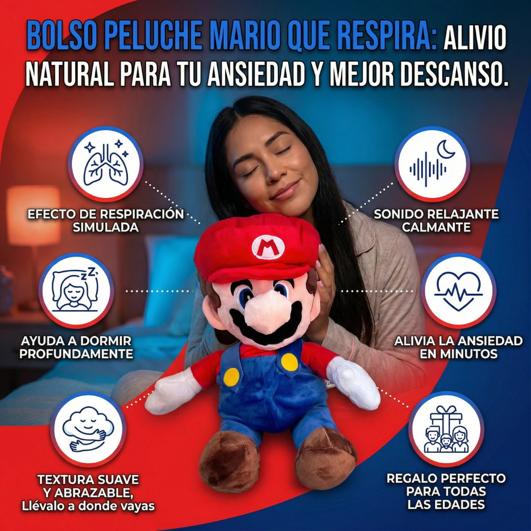 ¿Ansiedad o terrores nocturnos? Abraza el Bolso Peluche Mario que Respira y calma cuerpo y mente en minutos.